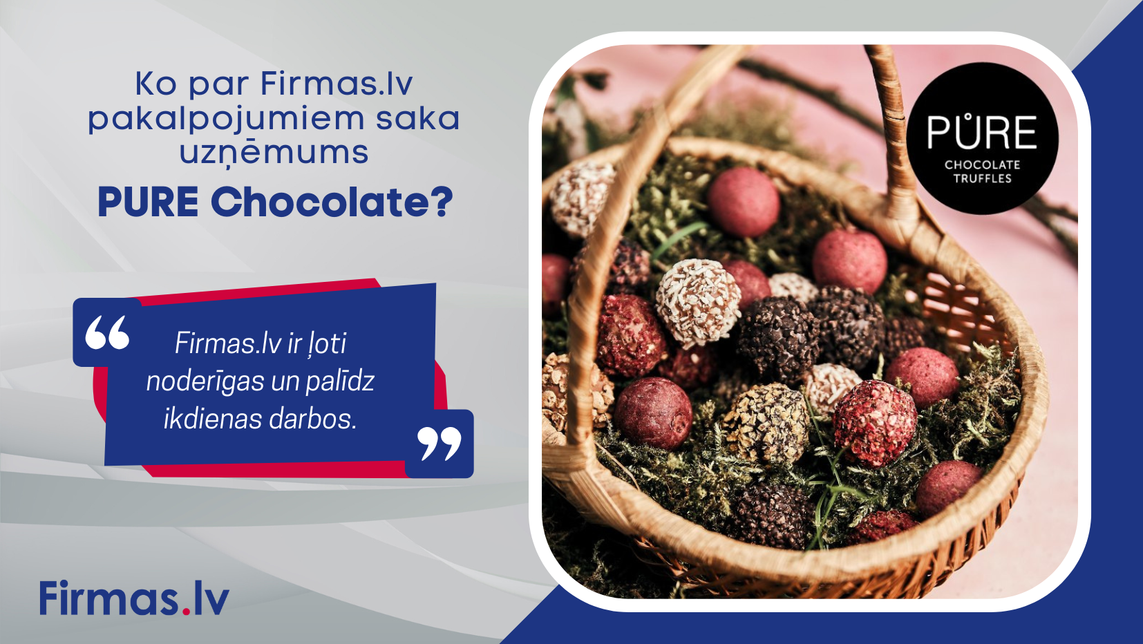 "PURE Chocolate” ir Latvijas saldumu ražotājs, kas darbojas jau vairāk nekā 10 gadus un ir specializējies augstākās kvalitātes trifeļu ražošanā. Uzņēmuma sortimentā ir gan sveramas trifeles, gan trifeļu asortī, trifeļu dāvanu kolekcijas, kā arī dāvanu komplekti tematiskiem svētkiem un korporatīvo dāvanu segments.