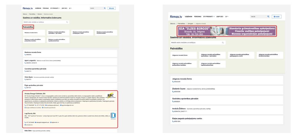 Papildus Firmas.lv piedāvā iespēju izveidot un izvietot biznesa profilu un / vai baneri Firmas.lv Valsts pārvaldes reģistros – unikālā pašvaldību un valsts pārvaldes institūciju datubāzē, kur vienkopus atrodamas visas Latvijas amatpersonas, departamenti un to kontaktinformācija.