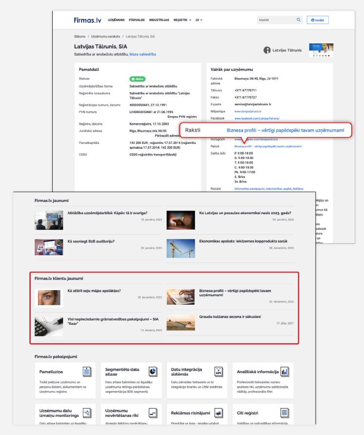 Biznesa profils ir viens no populārākajiem Firmas.lv mārketinga risinājumiem. Tas palīdz piesaistīt darījumam vai pirkumam jau gatavu auditoriju, proti, tādu, kura mērķtiecīgi meklē uzņēmuma piedāvātos produktus vai pakalpojumus.