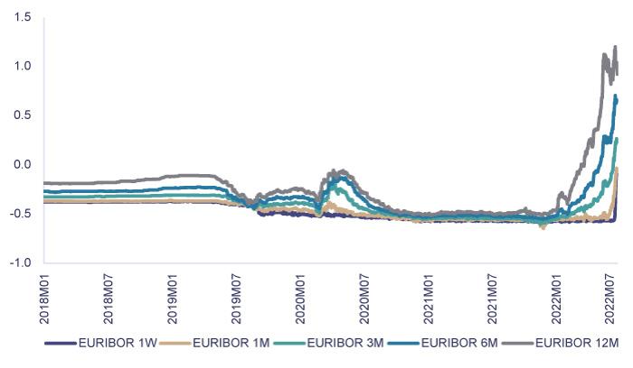 Finanšu tirgi reaģē apsteidzoši, balstoties uz gaidām par monetārās politikas izmaiņām, un finanšu tirgos procentu likmes gada pirmajā pusē pieauga, jau pirms ECB Padome tās pacēla. Tas atspoguļojas augstākās kredītu likmēs tautsaimniecībā. Piemēram, bieži lietotais 3 mēnešu EURIBOR indekss no aptuveni -0,5% pērnā gada nogalē jau jūlija sākumā iekāpa plusos un šī raksta tapšanas brīdī ir 0,23%. Tas nozīmē, ka kredītam ar mainīgu procentu likmi pēc nākamā pārrēķina mēneša maksājuma summa pieaugs. Finanšu tirgus dalībnieki, sagaidot tālāku ECB Padomes likmju celšanu, ieceno likmju kāpumu nākotnē. Piemēram, 2024. gada nogalē 3 mēnešu EURIBOR tiek cenots jau virs 1,3%. Vienlaikus ar kredītu likmēm iedzīvotājiem un uzņēmumiem aug valsts parāda apkalpošanas izmaksas, ierobežojot līdzekļus, ko valsts var atvēlēt dažādu vajadzību segšanai. Galu galā tas viss atspoguļojas zemākā ekonomiskā aktivitātē un mazākā spiedienā uz cenām.