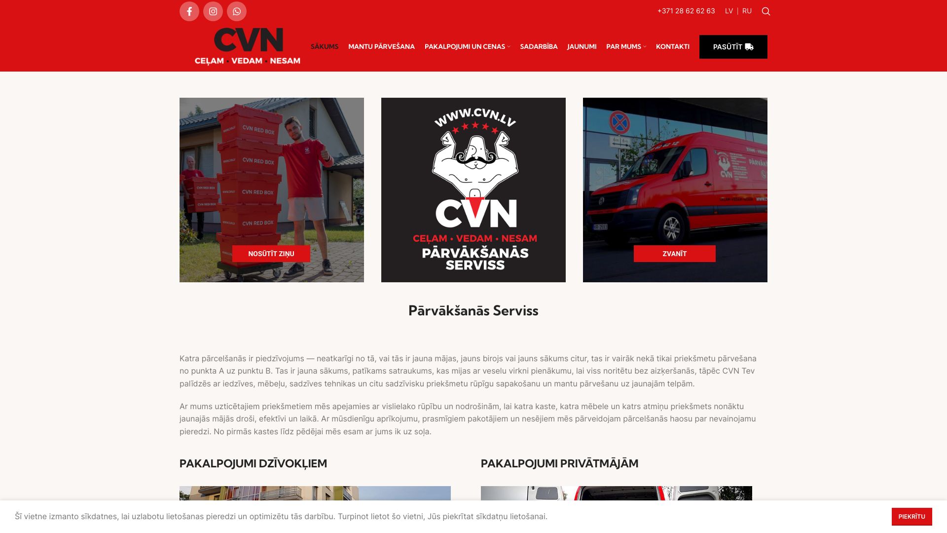 | Apraksts | "CVN" pārvākšanās serviss sāka savu darbību 2017. gada oktobrī, lai piedāvātu vieglu un ērtu pārcelšanās, kravas transporta un krāvēju pakalpojumus gan privātpersonām gan birojiem Latvijas tirgū. "CVN" pārvākšanās serviss nosaukumu veido trīs atslēgas vārdi: CEĻAM – VEDAM – NESAM, kas vislabāk raksturo uzņēmuma sniegtos pakalpojumus. Pārcelšanās un transporta pakalpojumus mūsu klientiem sniedz profesionāli un laipni darbinieki. Komandā ir apzinīgi, spēcīgi un zinoši puiši. Katram klientam nodrošinām individuālu pieeju, un esam gatavi uzklausīt jebkuras vēlmes un atrast vislabāko risinājumu. |