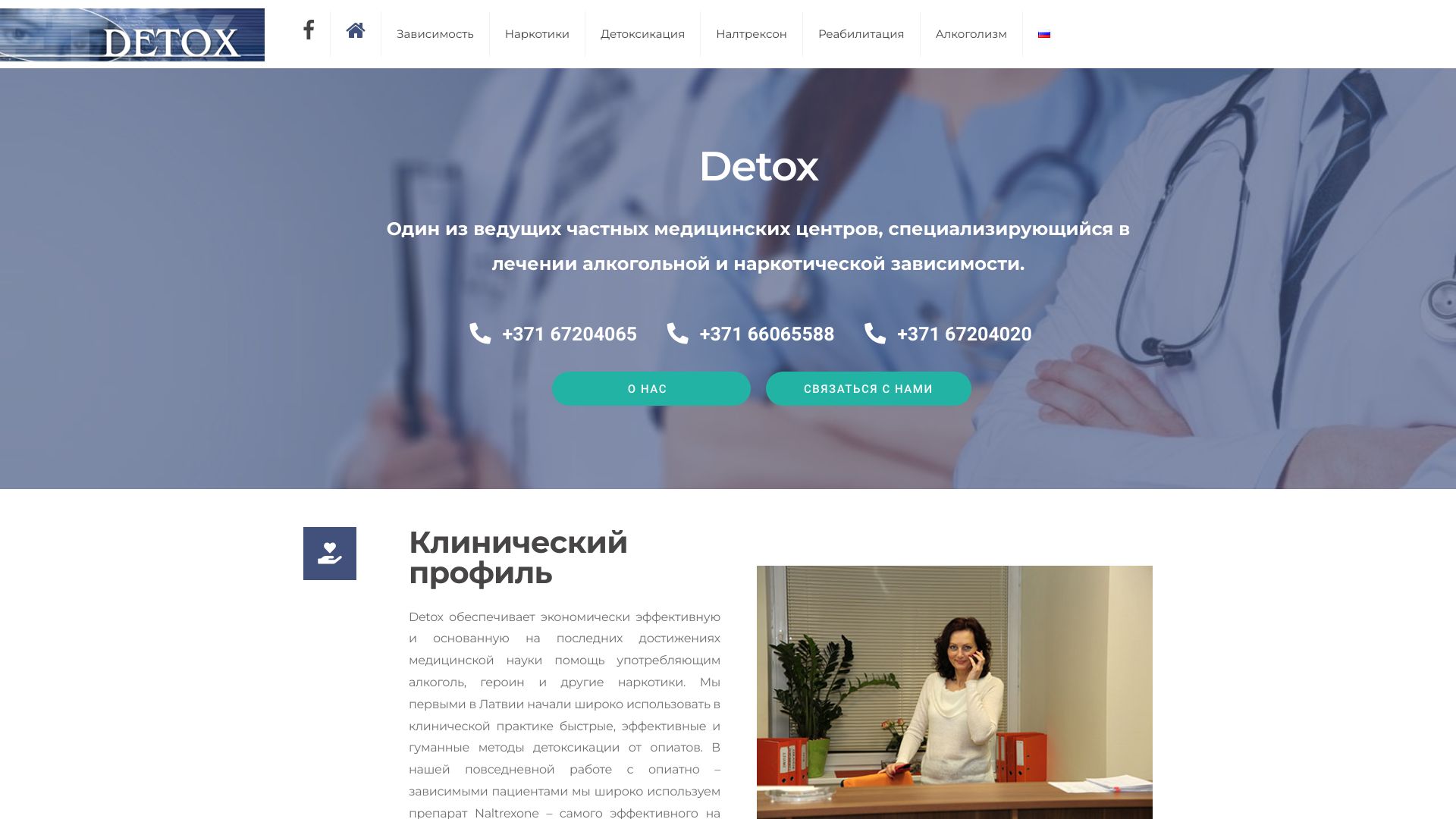 | Apraksts | "Detox" ir privāts medicīnas centrs, kas sniedz stacionāro un ambulatoro narkoloģisko palīdzību. Klīnika speciālisti veic alkoholisma un narkotiskās atkarības ārstēšanu ar modernām un starptautiski atzītām metodēm, tajā skaitā, izmantojot preparātu Naltrexone, kas palīdz izvairīties no opiātatkarības recidīvu atkārtošanās. Medicīnas centrā "Detox" ir iespējams iziet detoksikācijas procedūru, saņemt konsultācijas un patiesu informāciju par jebkura veida ķīmiskās atkarības ārstēšanas metodēm, kā arī sastādīt individuālu ārstēšanas plānu. Palīdzība narkomāniem un alkohola atkarīgiem tiek sniegta anonīmi un jebkurā diennakts laikā. |