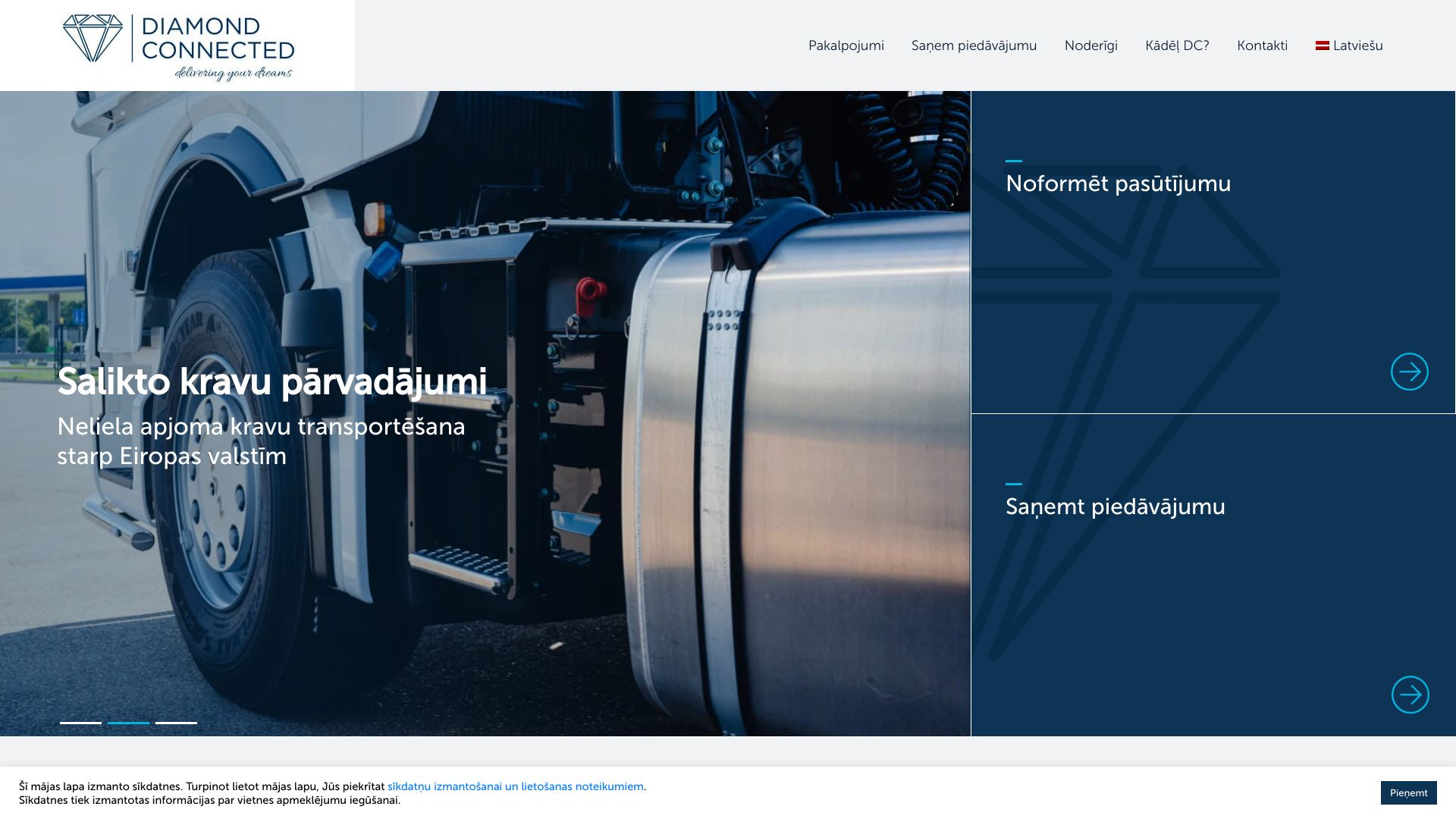 | Par uzņēmumu | Diamond Connected® - transporta un loģistikas uzņēmums ar 15+ gadu pieredzi. Starptautiskie salikto un pilno kravu pārvadājumi, lielgabarīta kravu un lauksaimniecības tehnikas transportēšana, motociklu transportēšana, vietējais un starptautiskais privātpersonu pārvākšanās serviss, loģistikas pakalpojumi, muitas brokeru un muitas noliktavas pakalpojumi, avio kravu pārvadājumi, specializēto un delikāto kravu iepakošana un transportēšana. |