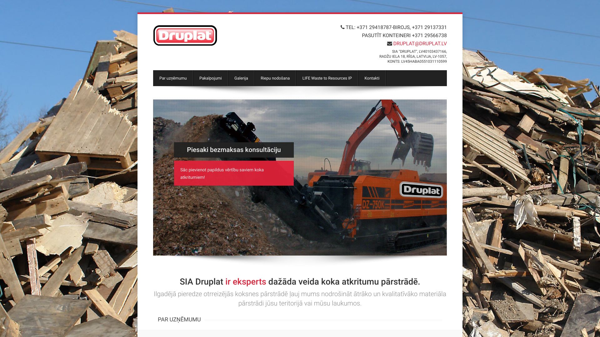 | Par uzņēmumu | SIA "Druplat" ir eksperts dažāda veida koka atkritumu pārstrādē. Ilggadējā pieredze otrreizējās koksnes pārstrādē ļauj mums nodrošināt ātrāko un kvalitatīvāko materiāla pārstrādi jūsu teritorijā vai mūsu laukumos. |