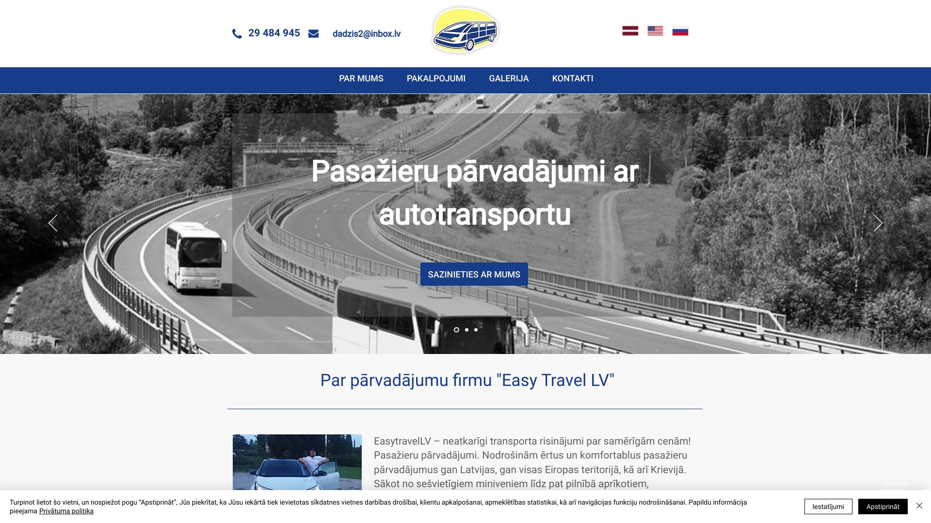 | Apraksts | Easy Travel LV - neatkarīgi transporta risinājumi par samērīgām cenām! Pasažieru pārvadājumi. Nodrošinām ērtus un komfortablus pasažieru pārvadājumus gan Latvijas, gan visas Eiropas teritorijā un Krievijā. Sākot no sešvietīgiem miniveniem līdz pat pilnībā aprīkotiem, komfortabliem 50-vietīgiem autobusiem, kas paredzēti ilgiem tūrisma pārbraucieniem. Transfēra pakalpojumi. Automašīnu noma. Pakalpojums pieejams gan Latvijas, gan Eiropas teritorijā. |