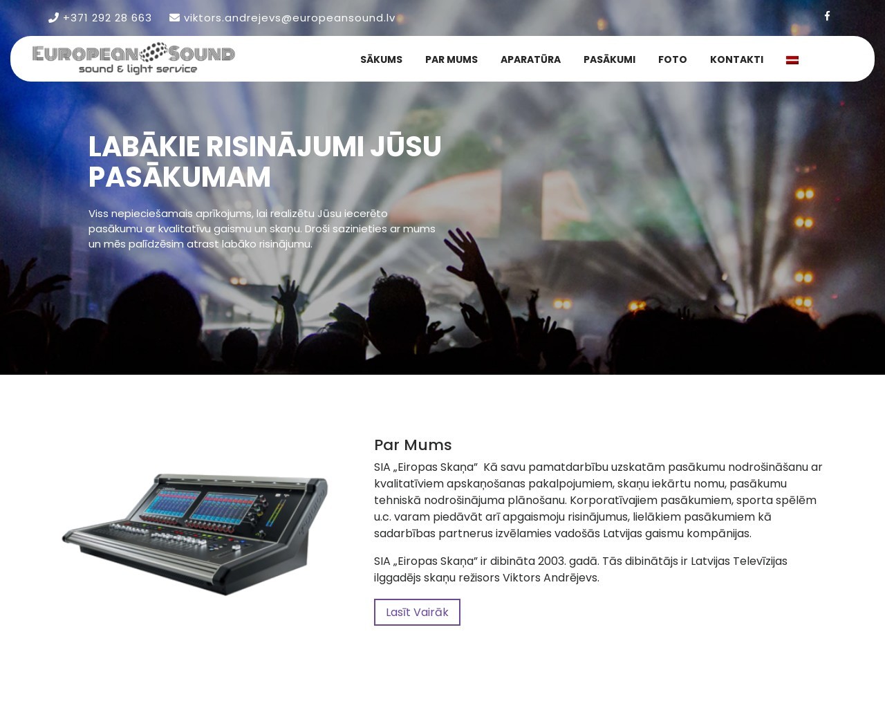 | Apraksts | "Eiropas Skaņas" komandu veido speciālisti ar ilggadēju pieredzi darbā ar skaņas un gaismas tehniku gan televīzijā, gan lielākajos Latvijas teātros. Piesaistām arī jaunos speciālistus pieredzes gūšanai un radošās dzirksts ienešanai ikdienas darbos. Kopš 2005. gada par savu tehnisko kodolu esam izvēlējušies jauna un kvalitatīva ražotāja KV 2 AUDIO izstrādātās skandas un to sistēmas, kuras ļauj mums nodrošināt kvalitatīvu un augstvērtīgu skanējumu no maziem dārza svētkiem līdz vairāku tūkstošu apmeklētāju pasākumam. |