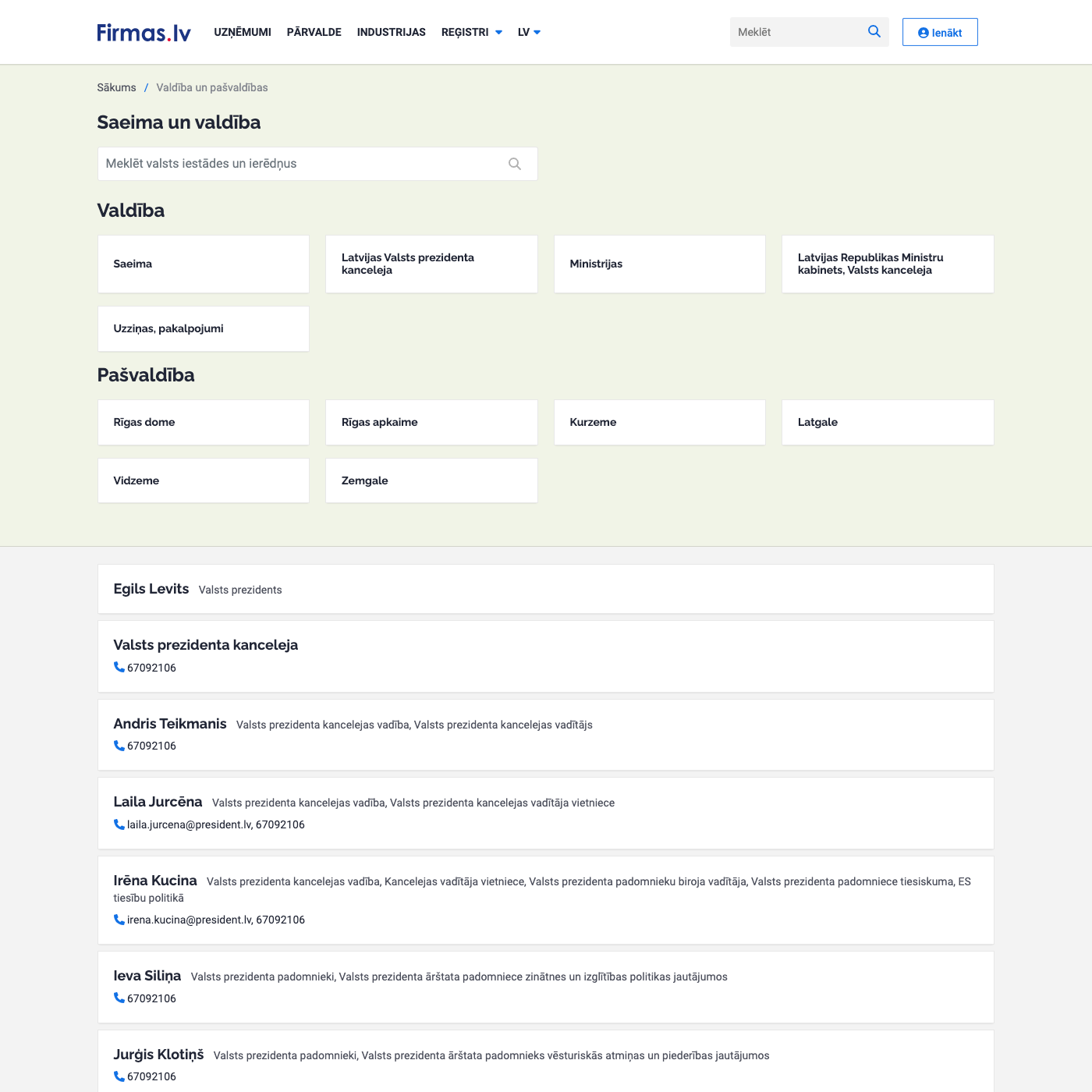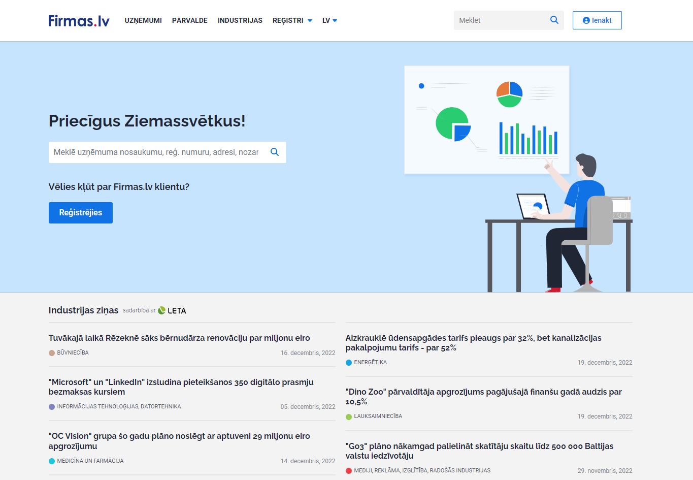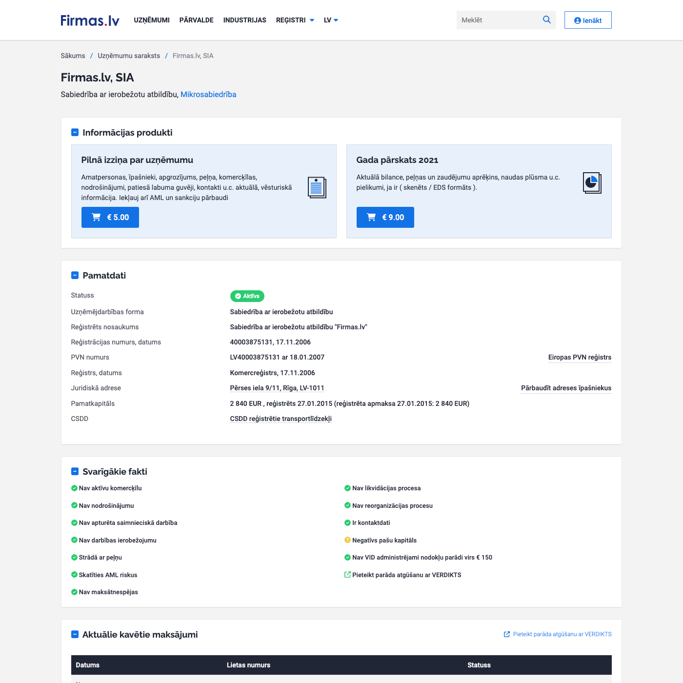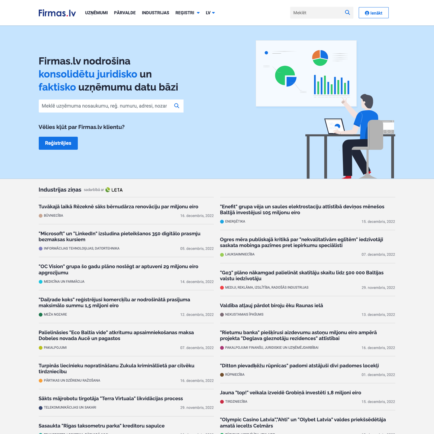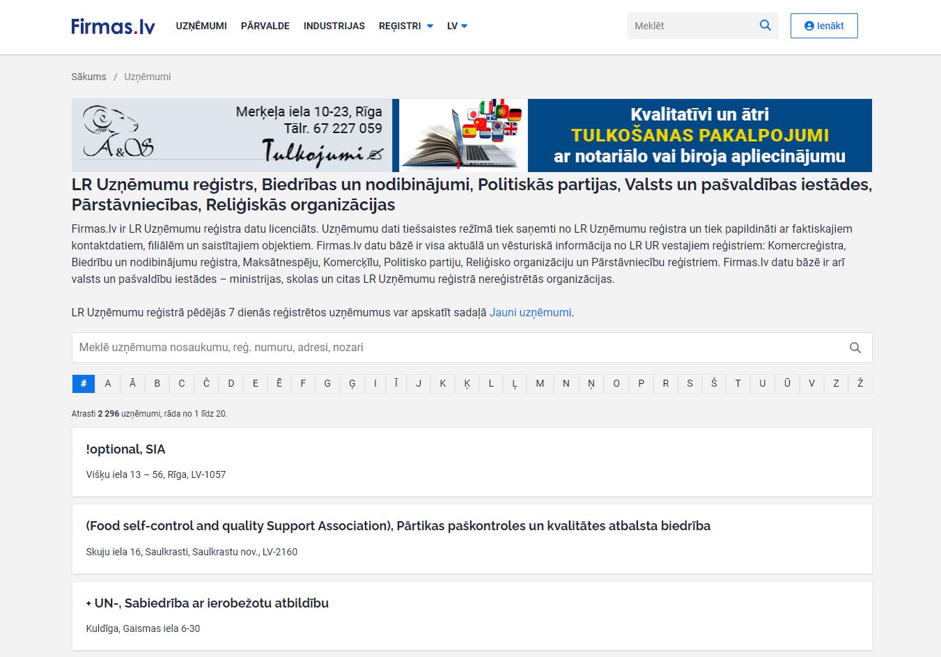 | Firmas.lv - viena no lielākajām juridisko un privātpersonu juridiskās informācijas datubāzēm | Firmas.lv ir viena no lielākajām juridisko un privātpersonu juridiskās informācijas datubāzēm Latvijā kopš 2006. gada. Šeit vienkopus atrodami dati no dažādiem oficiālajiem reģistriem, tai skaitā Uzņēmumu reģistra, CSDD reģistra, Valsts ieņēmumu dienesta, Valsts zemes dienesta un citiem. Sniedzam saviem klientiem detalizētu informāciju par Latvijas uzņēmumiem un iestādēm, to saistītajiem uzņēmumiem un filiālēm, uzņēmumu amatpersonām, vēsturiskajiem datiem, piedāvājam veikt monitoringu, segmentēto datu atlasi, kā arī integrēt datus sistēmās un izmantot uzņēmumu novērtēšanas rīkus. Firmas.lv ikdienā izmanto aptuveni 1600 profesionāli lietotāji – grāmatveži, juristi, pārdevēji –, kā arī tūkstošiem vienkāršu meklētāju. Firmas.lv palīdz novērst biznesa riskus un uzlabo darba produktivitāti, savlaicīgi sniedzot precīzu, pilnīgu un pārbaudītu informāciju. Mēnesī portālu apmeklē aptuveni 1 miljons reizes - lielā Firmas.lv popularitāte to padara arī par vērtīgu mārketinga kanālu, ar kura palīdzību popularizēt savu uzņēmējdarbību! Uzlabo sava uzņēmuma atrodamību un stiprini reputāciju, izvietojot biznesa profilu, reklāmrakstus, banerus un izmantojot citus mārketinga risinājumus. |