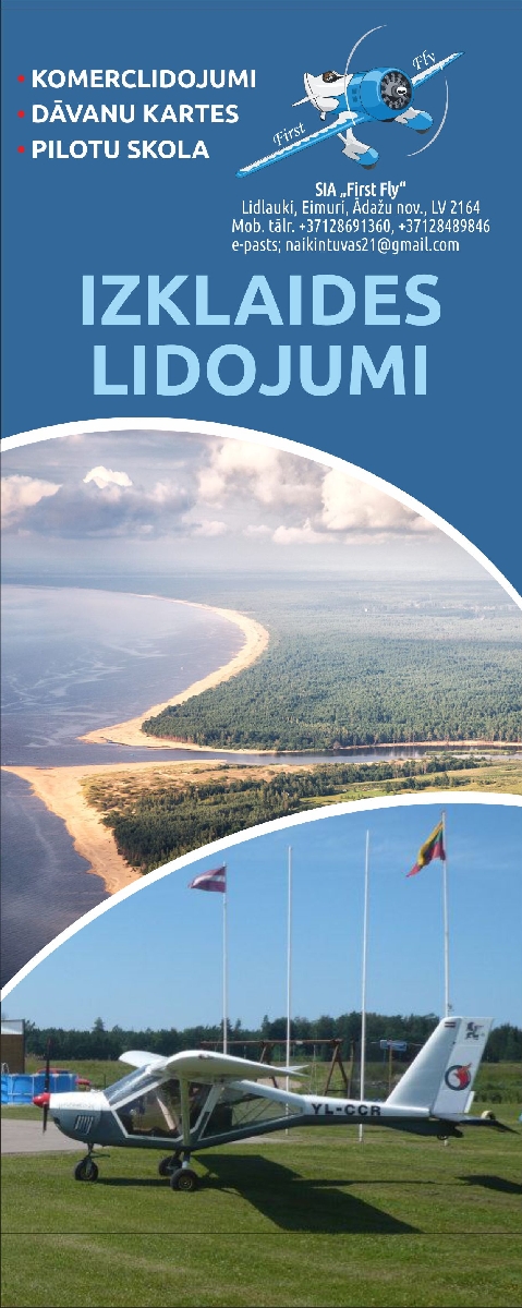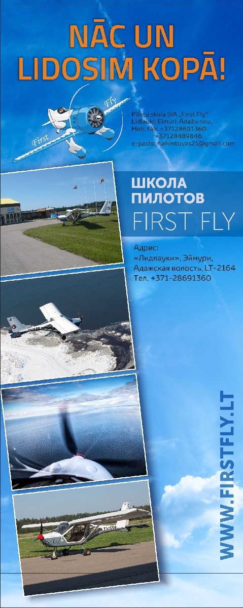 | Apraksts | Pilotu skola "First Fly" savu darbību uzsāka 2006. gadā. Tās dibinātājs Anatolijs Perekriostovs ir profesionāls un pieredzējis pilots-instruktors jau kopš 1986. gada, kā arī ir viens no "Baltic Bees Jet Team" – pirmās civilās aviācijas augstākās pilotāžas grupas Baltijā – dalībniekiem. Vēloties dalīties savās zināšanās, prasmēs un pieredzē, viņš nolēma atvērt savu skolu, lai sniegtu iespēju ikvienam, kurš vēlas iepazīt pasauli no putna lidojuma, piepildīt savu sapni un iemācīties patstāvīgi vadīt lidmašīnu. Pilotu skolā "First Fly" pieredzējušu pilotu-instruktoru vadībā tu apgūsi pamata zināšanas par aviāciju un praktiskās iemaņas pašam vadīt lidaparātu. Izejot pilnu apmācību kursu, saņemsi ultravieglās lidmašīnas pilota licenci, kas ļaus tev brīvi ceļot pa visu Eiropas Savienību un gūt jaunus, neaizmirstamus iespaidus un pozitīvas emocijas. |