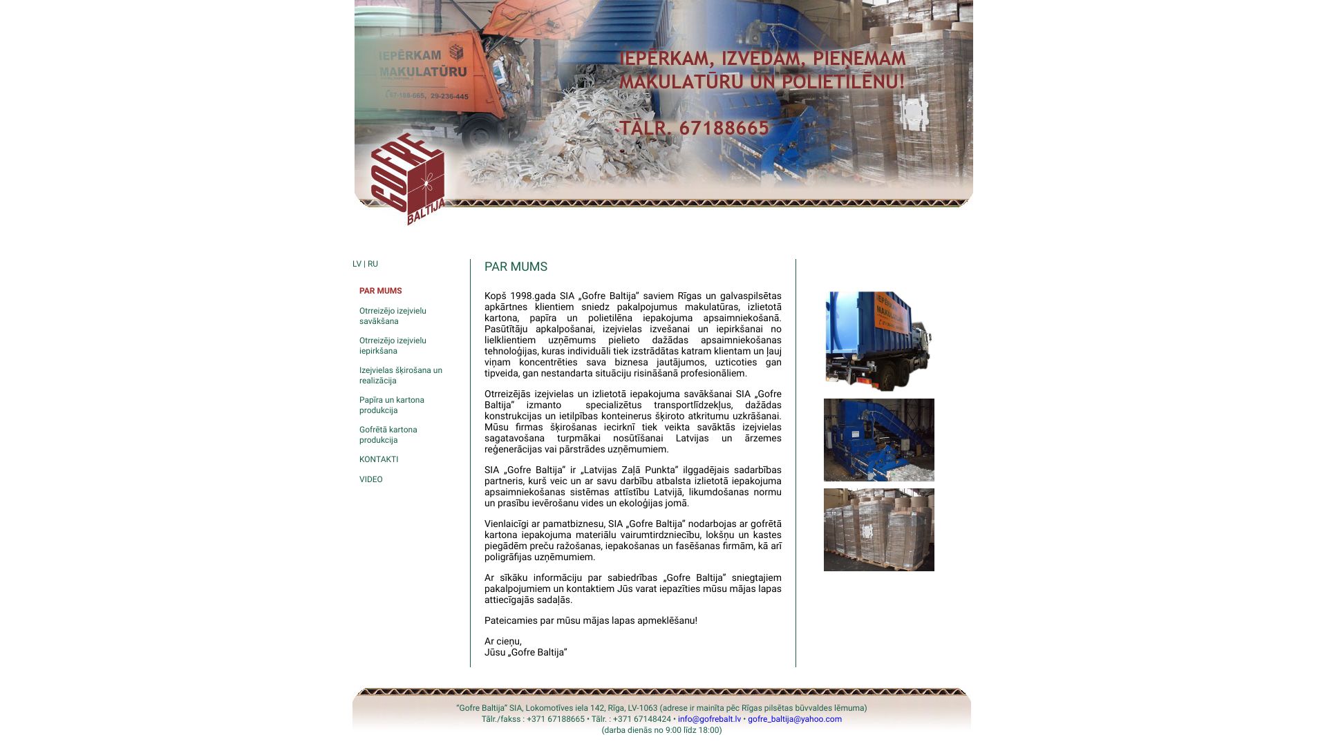 | Apraksts | Kopš 1998. gada SIA „Gofre Baltija” saviem Rīgas un galvaspilsētas apkārtnes klientiem sniedz pakalpojumus makulatūras, izlietotā kartona, papīra un polietilēna iepakojuma apsaimniekošanā. Otrreizējās izejvielas un izlietotā iepakojuma savākšanai SIA „Gofre Baltija” izmanto specializētus transportlīdzekļus, dažādas konstrukcijas un ietilpības konteinerus šķiroto atkritumu uzkrāšanai. |