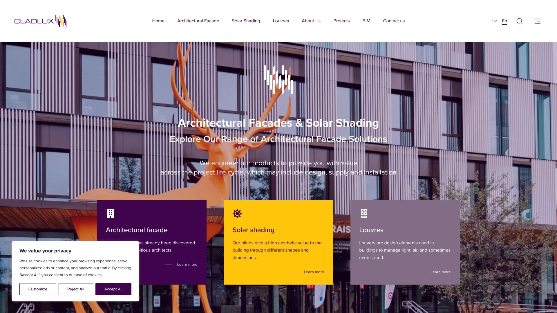 | Apraksts | "CLADLUX" ir specializēts uzņēmums, kas piedāvā augstākās kvalitātes arhitektūras fasādes apdares un saules aizsardzības risinājumus. Mūsu mērķis ir apvienot dizaina un funkcionalitātes elementus, radot estētiski pievilcīgas un energoefektīvas ēkas. |