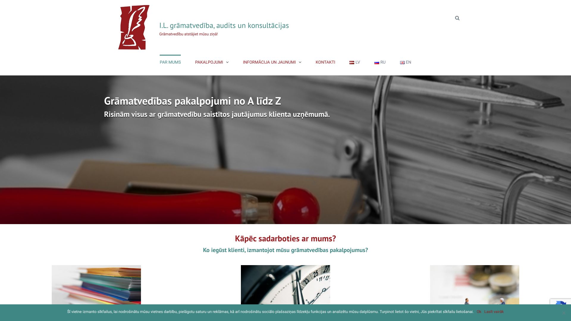 | Par mums | Grāmatvedības pakalpojumi no A līdz Z. Risinām visus grāmatvedības saistītos jautājumus klienta uzņēmumā. Sakārtota grāmatvedības uzskaite atbilstoši Latvijas Republikas likumdošanai. Jūs piegādājat mums grāmatvedības dokumentus, un pārējo paveicam mēs. Mūsu grāmatvedības pakalpojumi ir civiltiesiski apdrošināti. Uzņemamies visu ar grāmatvedību saistīto jautājumu risināšanu klienta uzņēmumā. Tostarp pārstāvam uzņēmumu Valsts ieņēmumu dienestā un citās valsts un pašvaldības institūcijās. Palīdzam rast risinājumus nodokļu optimizācijai. |