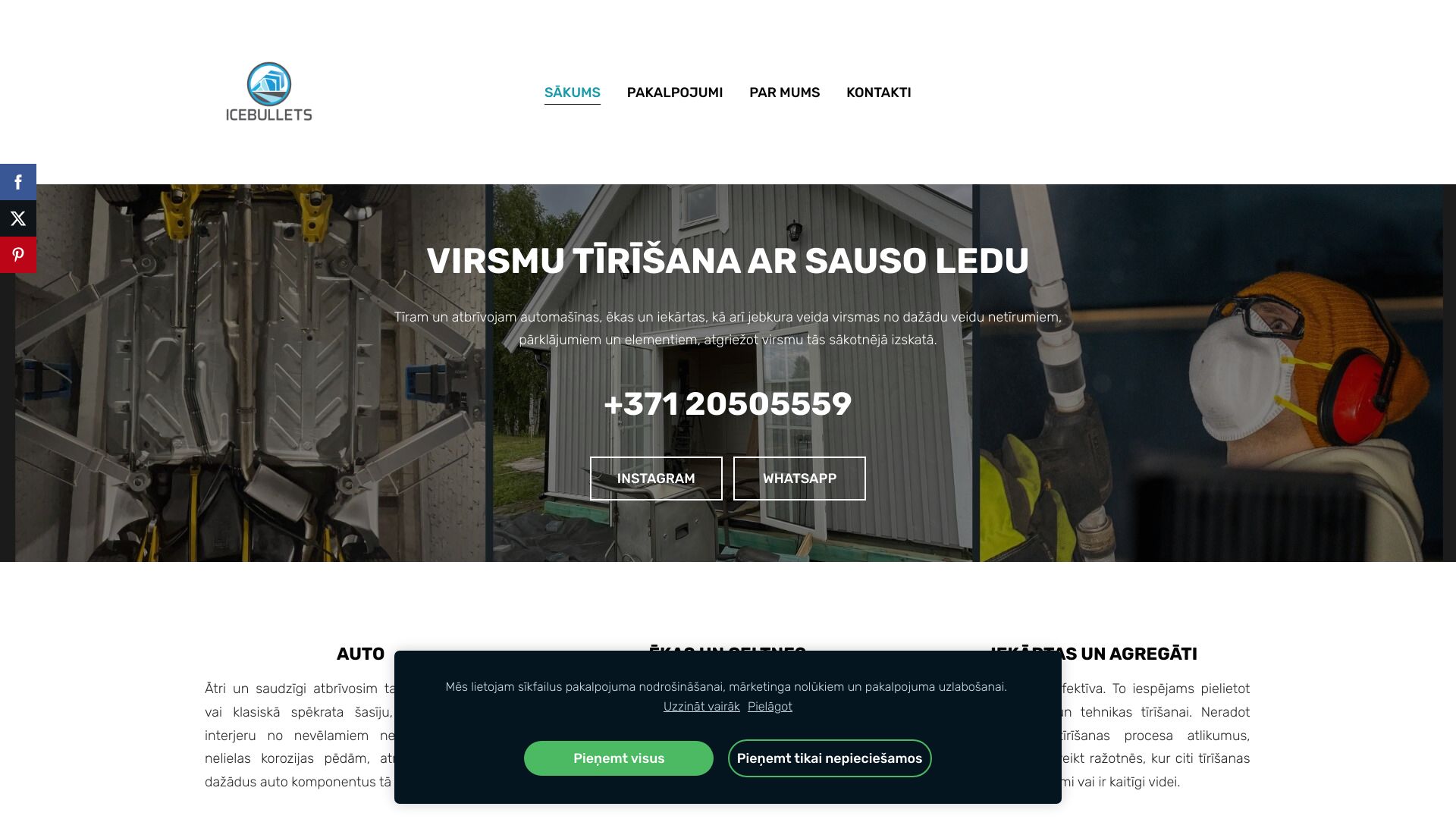 | Auto tīrīšana ar sauso ledu | Nodrošinam tīrīšanu ar sausā ledus tehnoloģiju. Attīram dažāda veida virsmas no nevēlamiem pārklājumiem. Esam mobili un spējam nodrošināt pakalpojumu tur kur nav pieļaujams nekāda veida piesārņojums tīrīšanas procesa laikā. Pakalpojums ir EFEKTĪVS / SAUDZĪGS / VIDEI DRAUDZĪGS. |