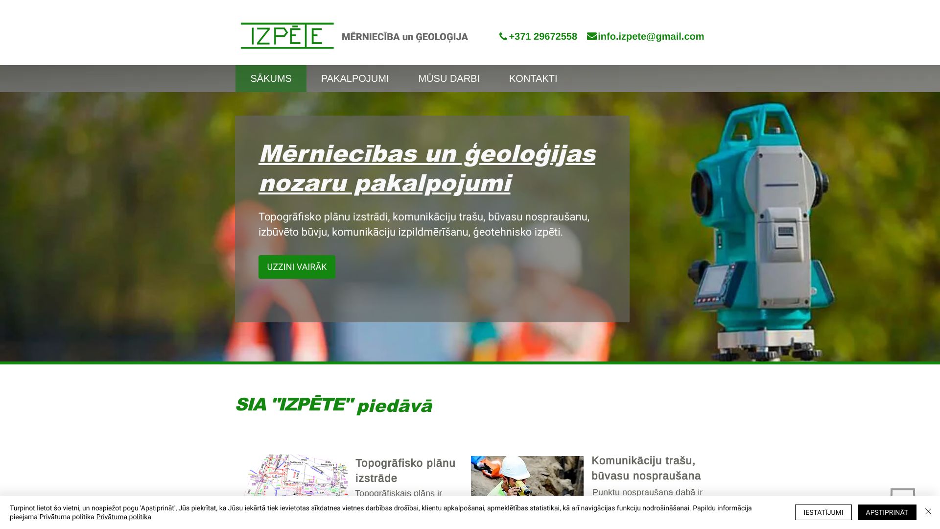 | Apraksts | SIA "IZPĒTE" mērniecības un ģeoloģijas nozaru pakalpojumi. Topogrāfiskais plāns ir nepieciešams dažādu plānošanas un projektēšanas stadiju posmos. Punktu nospraušana dabā ir darbība, kad pēc projekta izstrādātās dokumentācijas mērnieku brigāde izsprauž punktus apvidū. Izpilduzmērījuma plāns ir līdzīgs topogrāfiskajam plānam, jo tajā tiek attēloti virszemes un apakšzemes objekti. Ģeotehniskā izpēte ir process, kad veic grunts sastāva, pamatu atsegumu detalizētus izpētes darbus. |