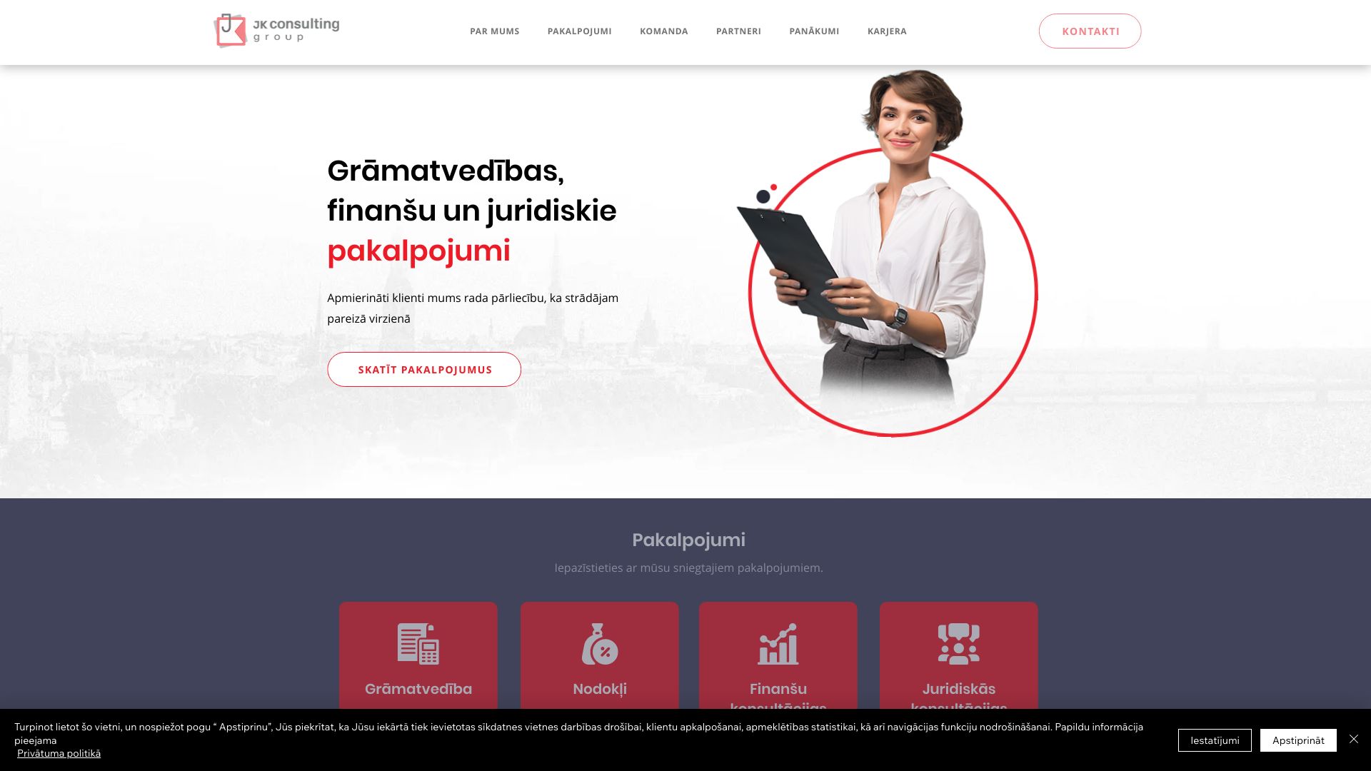| Apraksts | Uzņēmums "JK Consulting Group" tika dibināts 2013. gadā un jau pierādījis sevi kā uzticamu partneri ārpakalpojumu jomā. Mūsu mērķis ir vienuviet, pēc iespējas ātrāk un precīzāk, piemeklēt klienta prasībām atbilstošu risinājumu grāmatvedībā, jurisprudencē, uzņēmumu vadības, budžeta izstrādes un nodokļu optimizācijas jomās. Mūsu panākumu pamats ir mūsu klientu panākumi. |