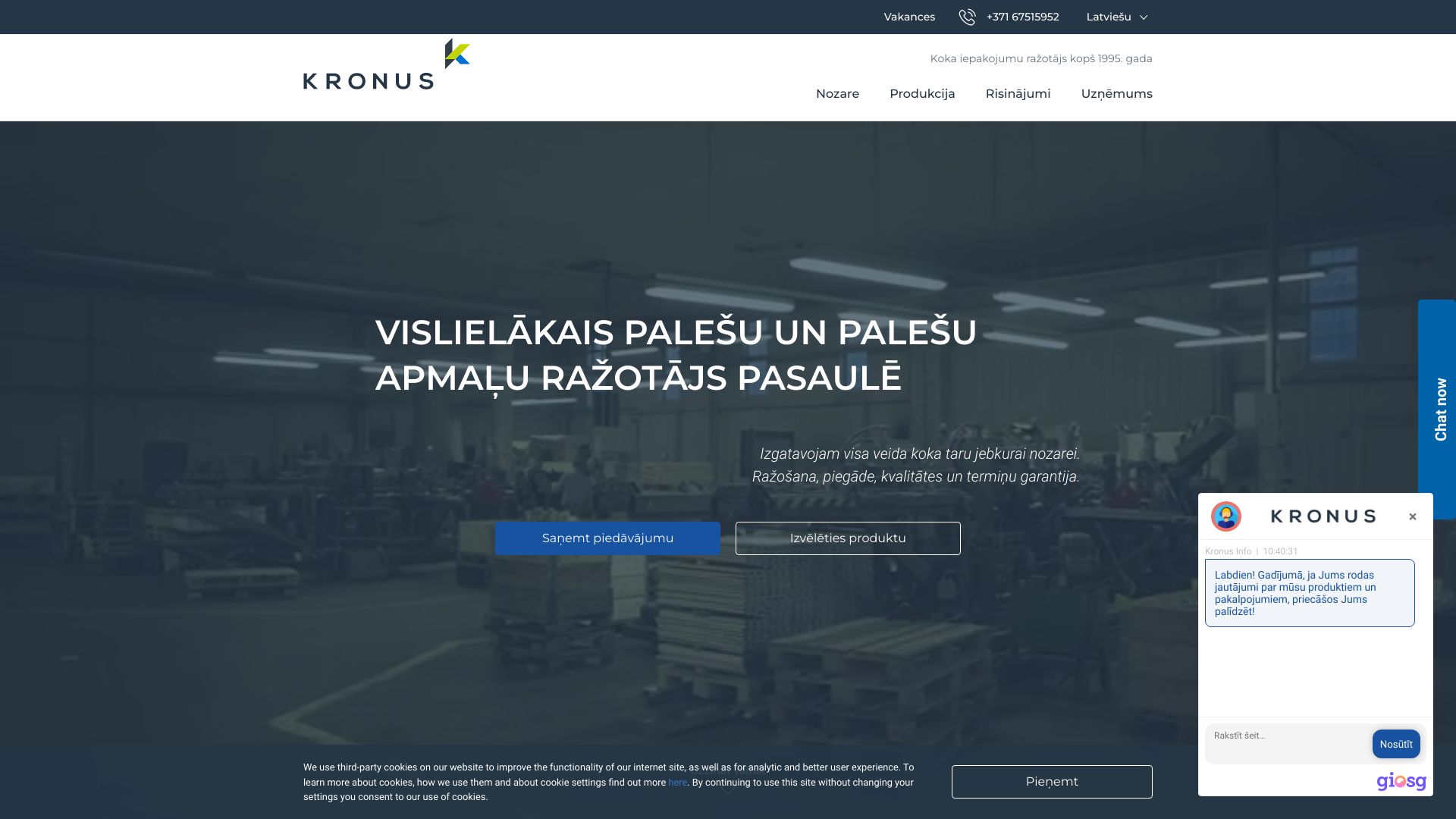 | Par uzņēmumu | Esam augošs pasaules līderis koka iepakojuma, ar tā saistīto pakalpojumu, vagu un puķu dobju veidošanai un dārza izstrādājumu, koka un tērauda izstrādājumu ražošanā, pārdošanā un izstrādē. Mūsu galvenais mērķis ir radīt produkciju un pakalpojumus, kas ir noderīgi mūsu klientiem visā pasaulē. Attīstoties kopš 1995.gada, KRONUS ir kļuvis par vienu no lielākajiem nozares uzņēmumiem ar gada apgrozījumu virs 80 mlj. EUR. Profesionāla komanda, produkcijas un pakalpojumu kvalitāte, izdevīgs ģeogrāfisks novietojums un koksnes resursu pieejamība ļauj KRONUS sekmīgi attīstīties gan Eiropā, gan visā pasaulē šobrīd preces tiek eksportētas uz vairāk nekā 60 pasaules valstīm. Visā ražošanas procesā, sākot no izejvielu iegādes līdz pat gatavās produkcijas piegādei gala patērētājiem, mēs nodrošinām nemainīgu produkcijas kvalitāti, kas atbilsts starptautiskajiem standartiem. |