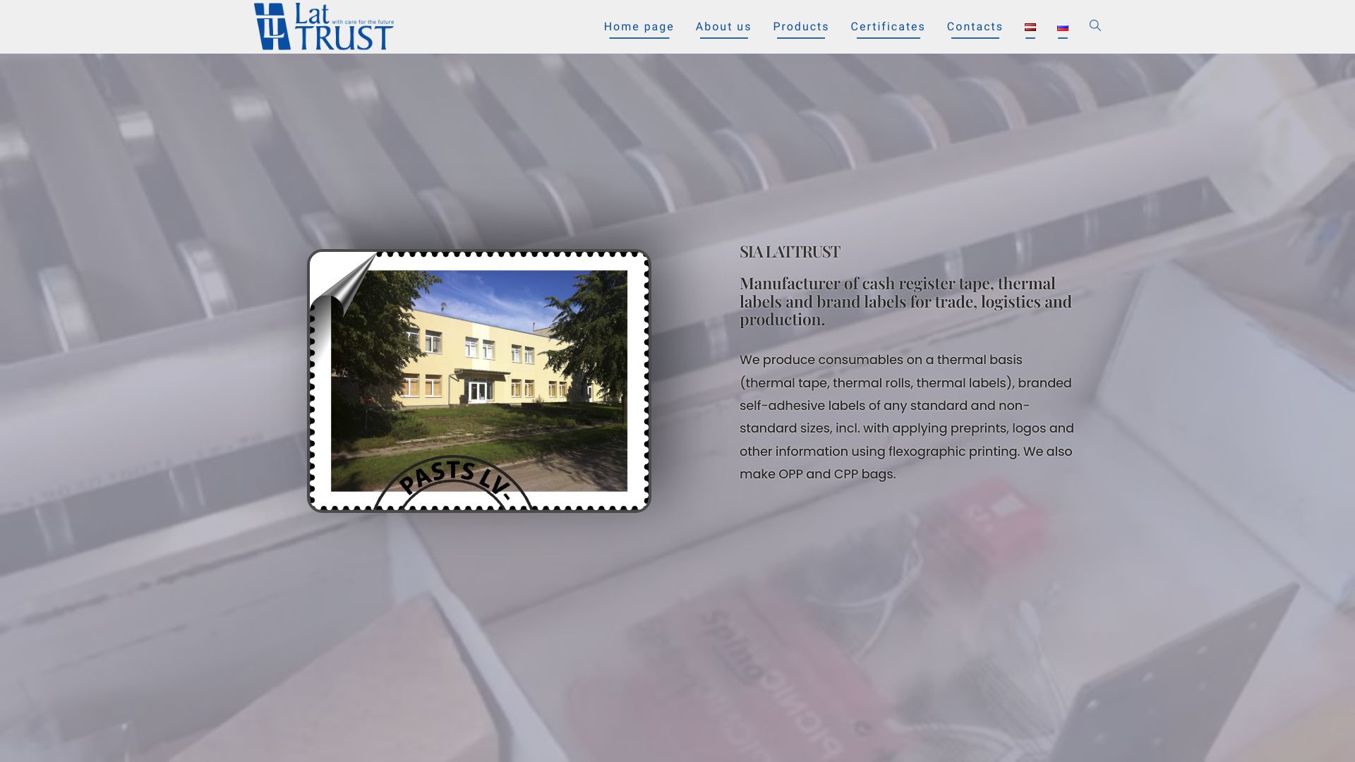 | Apraksts | Kases lentu, termo etiķešu un zīmolu etiķešu ražotājs tirdzniecībai, loģistikai, ražošanai. Mēs ražojam dažādus izstrādājumus uz termālā papīra pamatnes (termolente, termoruļļi, termoetiķete), kā arī standarta un nestandarta izmēra zīmola pašlīmējošās etiķetes, tai skaitā ar fleksogrāfisku apdruku – logotipu vai citu informāciju. Mēs ražojam arī OPP un CPP maisiņus. |