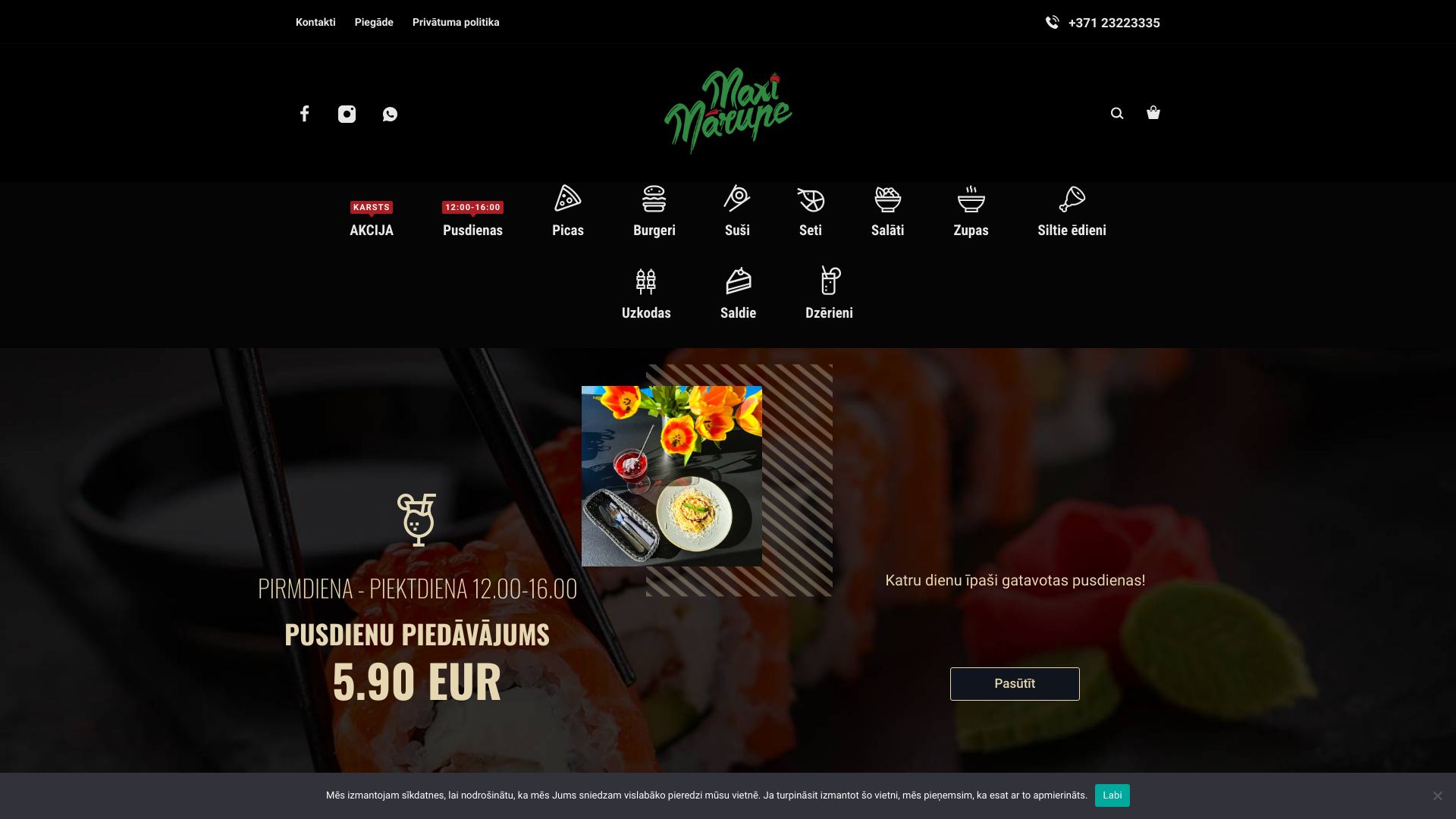 Pusdienu piedāvājums, kafejnīca, pusdienas, picas, burgeri, suši, salāti, seti, zupas, siltie ēdieni, uzkodas, saldie ēdieni, dzērieni, īpašie pusdienu piedāvājumi, siltie suši, rolli, ceptie suši, Nigiri/Gunkan, aukstā zupa, soļanka, vistas burgers, meksikāņu burgers, veģetārais burgers, sieru pica, desu pica, šķiņķa pica, vasaras pica, bekona pica, sēņu pica, veģetārā pica, havajiešu pica, carbonara pica, pepperoni pica, poke ar lasi, poke ar garnelēm,...