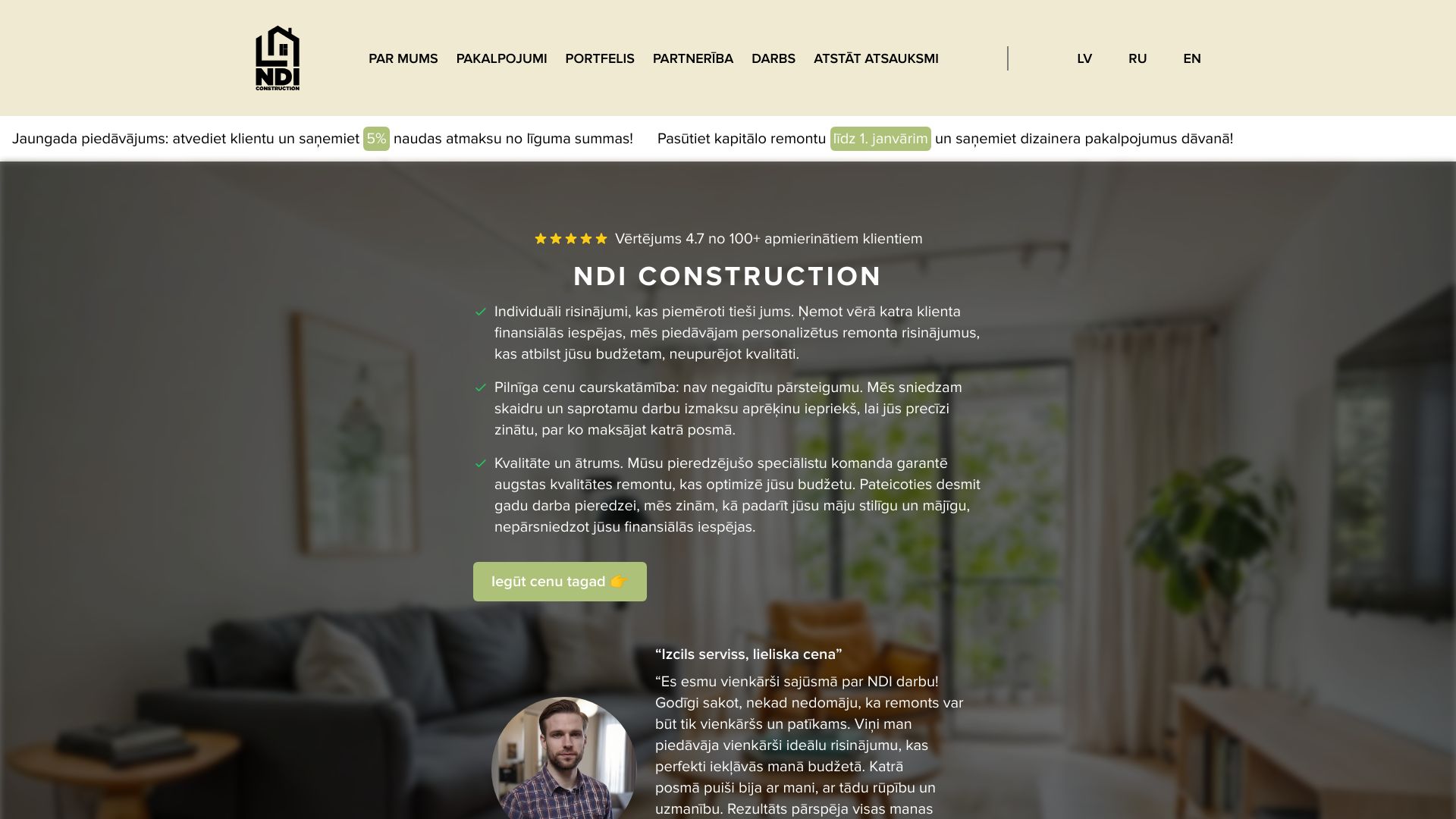 | Par mums | SIA "NDI Holding" ir profesionāļu komanda, kas specializējas māju būvniecībā no nulles, ārējo fasāžu darbu veikšanā un dzīvojamo un komerciālo telpu kapitālajā remontā. Kopš mūsu dibināšanas mūsu mērķis ir ne tikai uzbūvēt māju vai veikt remontu, bet radīt jums mājīgu un uzticamu mājokli vai darba telpu, kas atspoguļos jūsu dzīvesveidu vai biznesa tēlu, atbilstoši visām jūsu vajadzībām un cerībām.