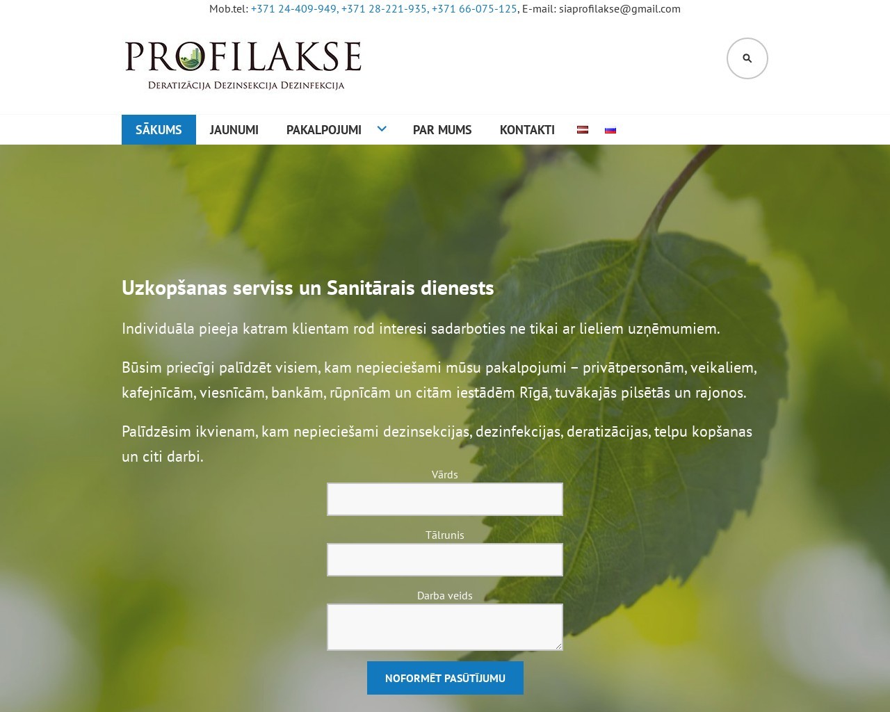 | Apraksts | SIA "Profilakse" ir pieredzējis sanitārais dienests, kas kopš 1996. gada nodrošina augstas kvalitātes dezinfekcijas, dezinsekcijas un deratizācijas pakalpojumus privātpersonām un juridiskām personām Rīgā un tuvākajos novados. Uzņēmuma galvenais mērķis ir radīt komfortablu, drošu un higiēnisku vidi, cīnoties pret kaitēkļiem un grauzējiem, kas var apdraudēt cilvēku veselību, sabojāt pārtiku vai noliktavu iekārtas. SIA Profilakse piedāvā efektīvus risinājumus, izmantojot modernu tehnoloģiju iekārtas, profesionālus preparātus un pieredzējušu speciālistu komandu. |