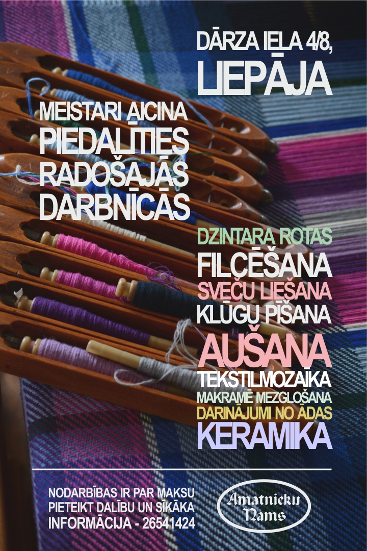 Amatniecība, amatu apmācības, radošās darbnīcas, dzintara rotu darbnīca, ādas izstrādājumu darbnīca, šķelto klūgu darbnīca, sveču un ziepju gatavošanas darbnīca, aušanas darbnīca, šūšanas darbnīca, tekstilmozaīkas šūšanas darbnīca, rokdarbu darbnīca, keramikas darbnīca, metāla rotkaļu darbnīca, daiļamatniecība, Latvija, Liepāja, Liepaja travel, Liepājas Amatnieku nams, aušana, austie audumi, rokdarbi, adījumi, tamborēšana, izšūšana, batika, mezglošana...