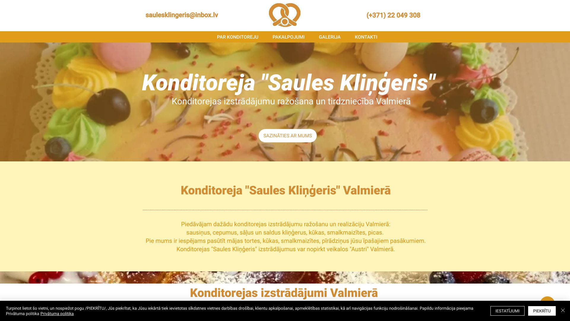 Konditorejas ražotne, pasūtījumi, tirdzniecība. Beķereja. Konditorejas izstrādājumi, ražošana, tirdzniecība, vairumtirdzniecība. Konditoreja Valmierā. Saules kliņģeris, kliņģeri, sāļie kliņģeri, cepumi, riekstiņi, picas. Konditoreja Valmierā, konditorejas pasūtījumi Valmierā, pasūtījumi kāzām, tortes, mājas tortes, mājas tortes Valmierā, kūkas.