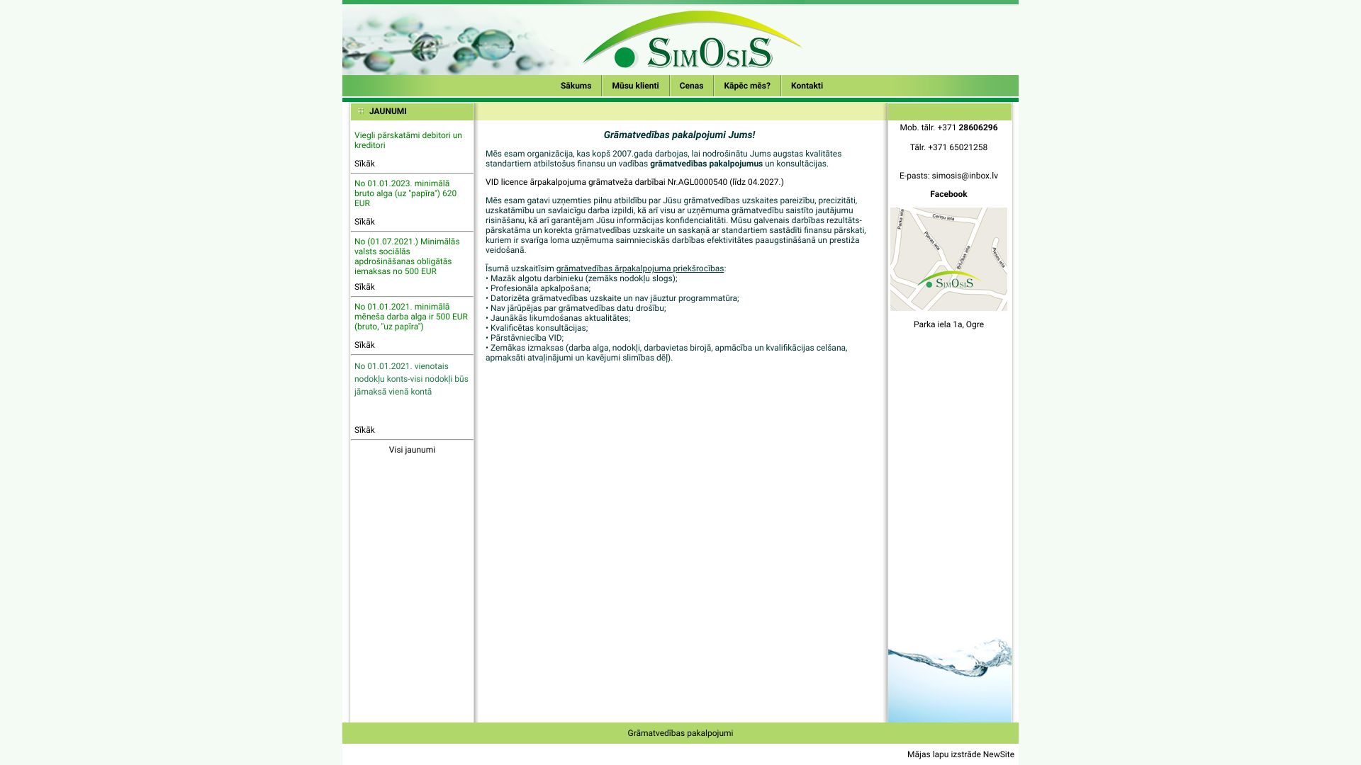 | Apraksts | "Simosis", SIA - mūsdienīgi grāmatvedības pakalpojumi. Viegli pārskatāmi debitori un kreditori, ērti izrakstīt un nosūtīt rēķinus klientiem (tai skaitā ar vai bez atgādinājumu sūtīšanas par kavējumiem), arī periodiski sūtāmiem rēķiniem. |