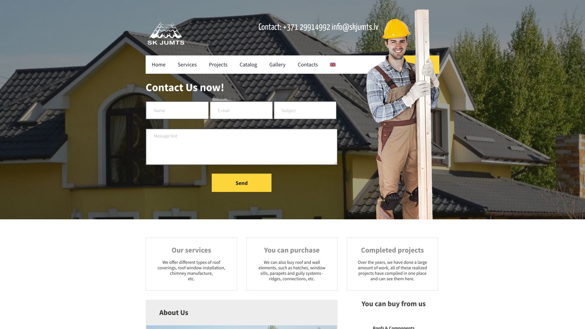 | Apraksts | „SK Jumts” piedāvā dažāda veida jumtu seguma ieklāšanu, nomaiņu, kausēto ruberoīda jumtu uzkarsēšanu. Visa veida skārdnieku un jumiķu darbus. Mansardu un jumta konstrukciju izbūvi, jumta logu montāžu, dūmvadu izgatavošanu. Piemeklēsim Jums vēlamāko variantu. Jumtu un sienu segumu tirdzniecība. |