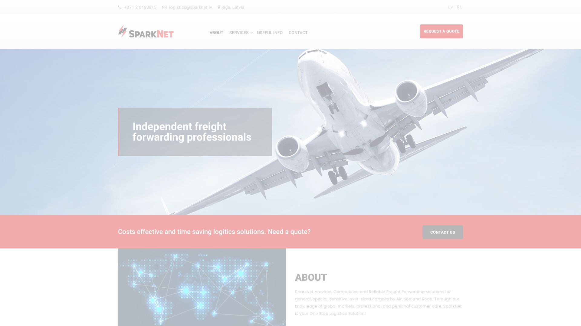| Par uzņēmumu | SIA "SparkNet" nodrošina konkurētspējīgus un uzticamus kravu ekspedīcijas risinājumus vispārīgām, īpašām, trauslām, lielgabarīta kravām pa gaisu, jūru un autoceļiem. Pateicoties mūsu zināšanām par globālajiem tirgiem, profesionālajai un personīgajai klientu apkalpošanai, SparkNet ir jūsu vislabākais loģistikas risinājums! |