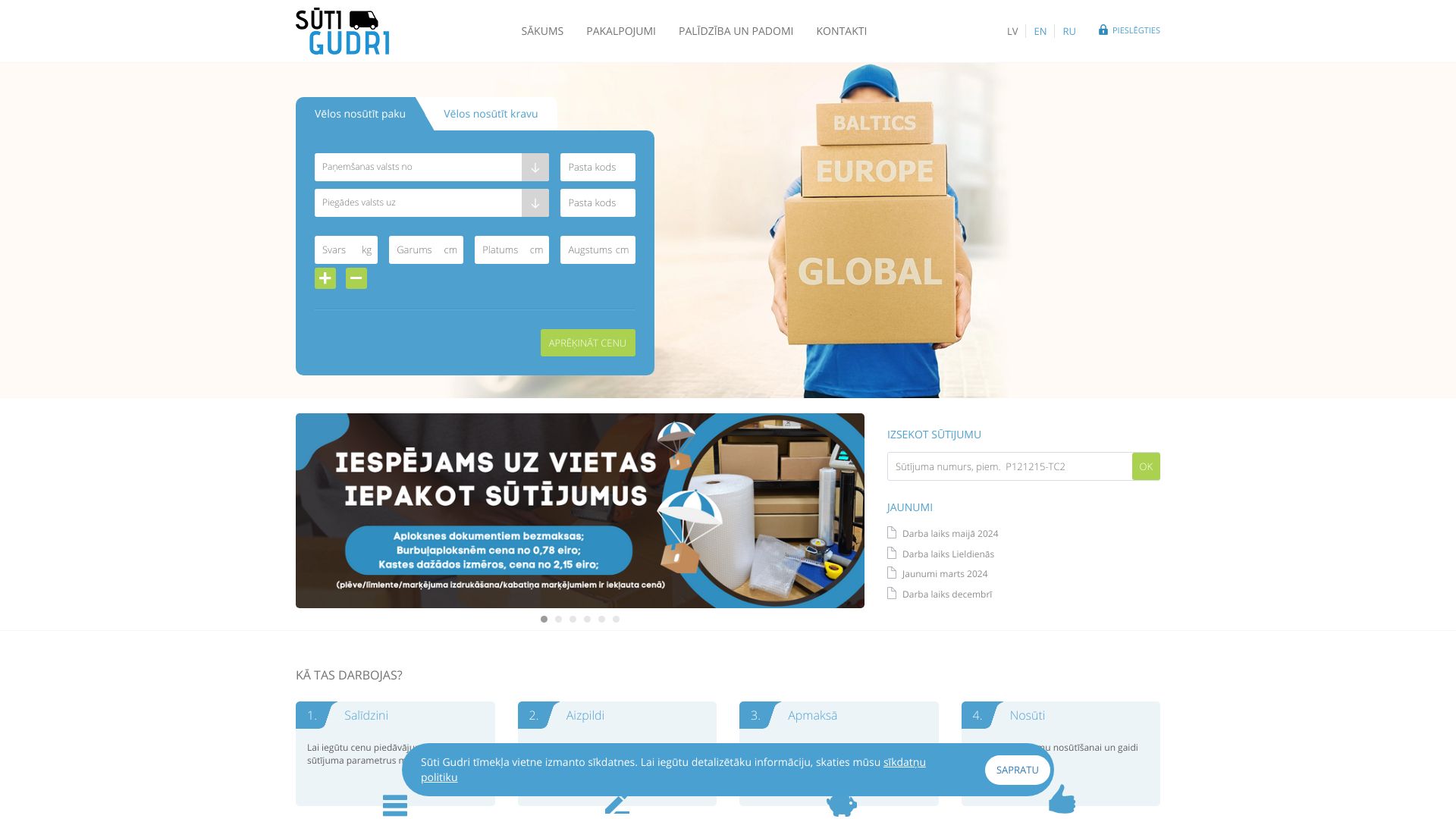 | Par uzņēmumu: | Sūti gudri ir gudrs veids sūtījumu nosūtīšanai. Jūsu ērtībām apvienojām uzticamos kurjerdienestus vienā mājas lapā, lai sniegtu Jums labāko servisu. Ienāc, salīdzini, nosūti. |