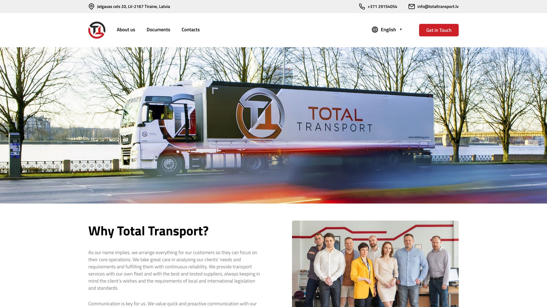 | Apraksts | Sniedzam transporta pakalpojumus ar savu autoparku un labākajiem un pārbaudītajiem piegādātājiem, vienmēr paturot prātā klienta vēlmes un vietējās un starptautiskās likumdošanas un standartu prasības. "Total Transport" sniegs jums to, kas jums nepieciešams! Mūsu mērķis ir strādāt pie ilgtermiņa partnerības ar mūsu klientiem bez sarežģītām konstrukcijām. |