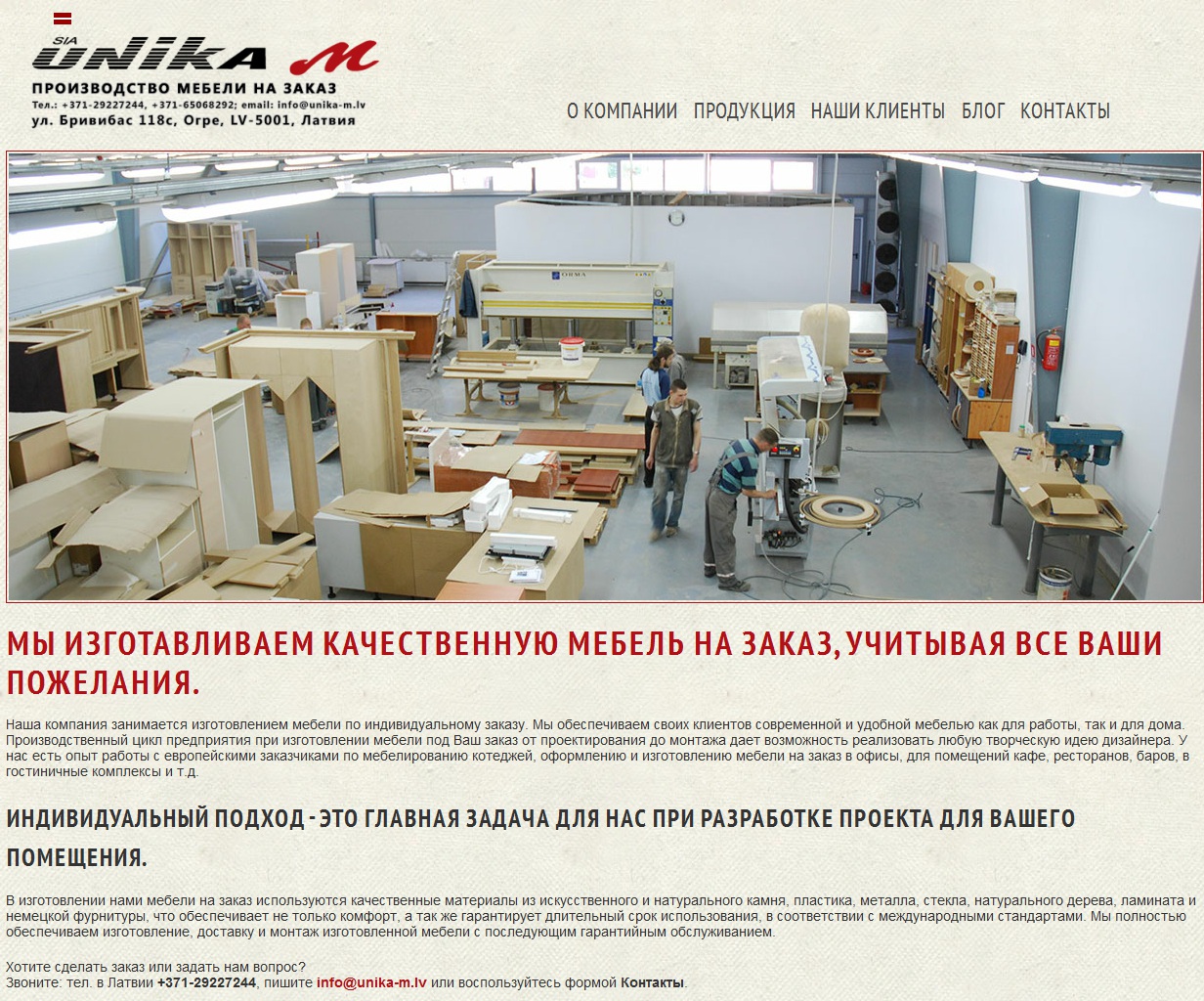 | Apraksts | Mūsu firma nodarbojas ar mēbeļu izgatavošanu pēc pasūtījuma, izmantojot visjaunākās tehnoloģijas un materiālus – dabīgo akmeni, plastikātu, metālu, stiklu, koku, laminātu un vācu furnitūru. Mēs veicam mēbeļu izgatavošanu, piegādi un uzstādīšanu, kā arī nodrošinām garantiju noteiktajos termiņos. |