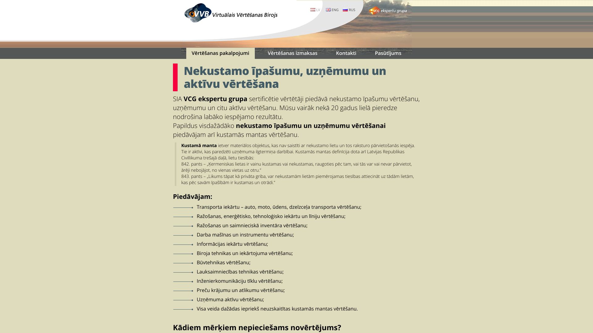 Nekustamā īpašuma, dzīvokļu, nedzīvojamo telpu, dzīvojamo māju, ēku, zemesgabalu, komercēku vērtēšana visā Latvijas teritorijā. Rūpnieciskās apbūves objektu, mežu vērtēšana. Vērtēšana kredītu saņemšanai. Vērtējumus atzīst vadošajās Latvijas komercbankās. Mantisko ieguldījumu vērtēšana iesniegšanai LR Uzņēmumu reģistrā, (Līva kompetences sertifikāts Nr. 6). Novērtēšana, vērtēšana. NĪ novērtēšana, īpašuma novērtēšana, KĪ novērtēšana, aktīvu novērtēšana....