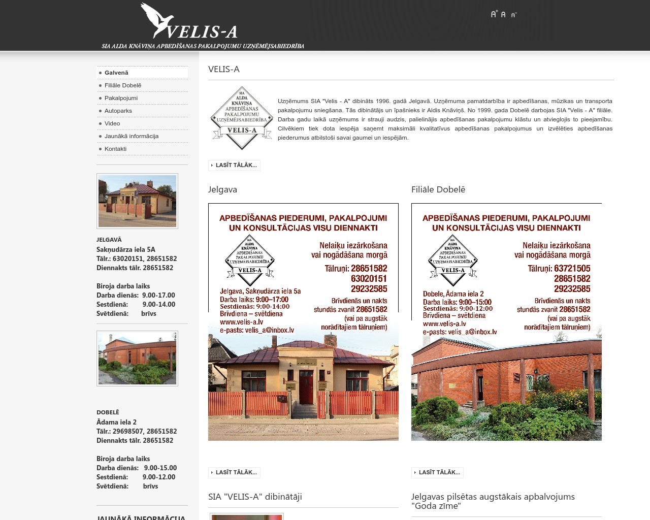 | Par uzņēmumu | Uzņēmums SIA "Velis - A" dibināts 1996. gadā Jelgavā. Uzņēmuma pamatdarbība ir apbedīšanas, mūzikas un transporta pakalpojumu sniegšana. Tās dibinātājs un īpašnieks ir Aldis Knāviņš. No 1999. gada Dobelē darbojas SIA "Velis - A" filiāle. Darba gadu laikā uzņēmums ir strauji audzis, palielinājis apbedīšanas pakalpojumu klāstu un atvieglojis to pieejamību. Cilvēkiem tiek dota iespēja saņemt maksimāli kvalitatīvus apbedīšanas pakalpojumus un izvēlēties apbedīšanas piederumus atbilstoši savai gaumei un iespējām. |