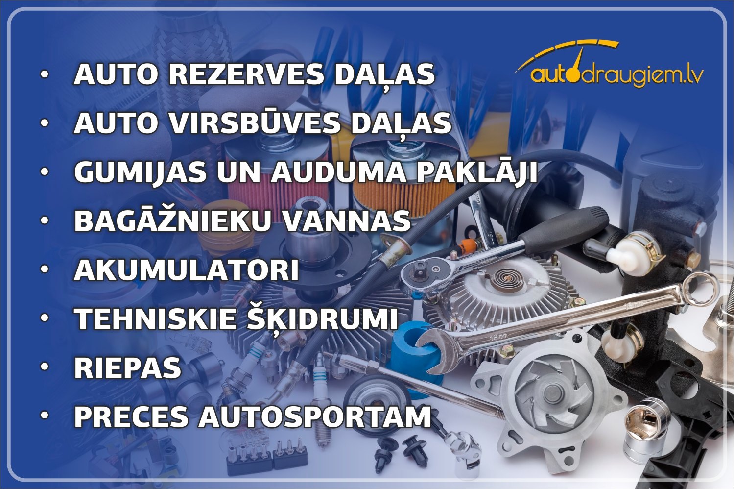 Meklējot kvalitatīvas un uzticamas auto rezerves daļas internetā, ir vērts iegriezties "autodraugiem.lv" – internetveikalā, kurā atrodamas rezerves daļas jebkuram auto un par ļoti izdevīgām cenām, kas būtiski atšķiras no autocentros un veikalos piedāvātajām. Uzņēmums "autodraugiem.lv" strādā tā, lai ikvienam sniegtu maksimāli patīkamu iepirkšanās pieredzi, iegādājoties auto rezerves daļas internetā. Pircējiem tiek garantēta kvalitatīva prece tikai no drošticamiem izplatītājiem un ar ātru piegādi līdz ērtākajai preces saņemšanas vietai. Kāpēc gan tērēt laiku, apbraukājot daudzus veikalus, ja var atrast visas vajadzīgās auto rezerves daļas internetā – "autodraugiem.lv" – un labi ietaupīt?